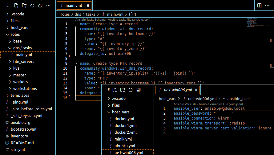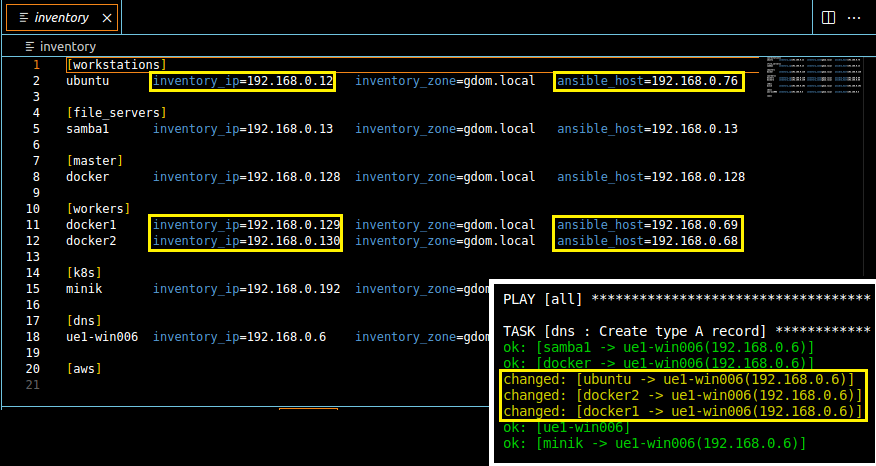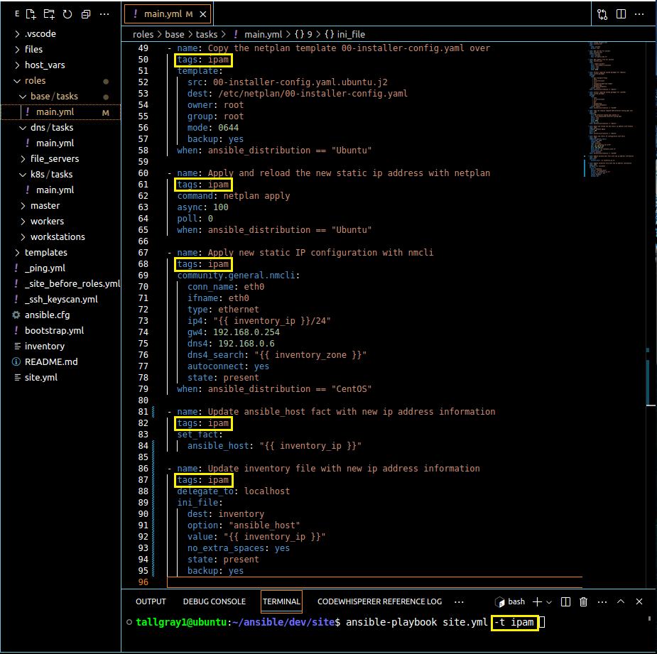 To maintain streamlined administration and management, it’s crucial to centralize host naming, IP address assignment, and zone allocation. Scroll back up and take another look at snapshots 2 and 3. If you recall from the previous article, when we defined the “inventory” file, we only set the DNS hostname under each [group] category. Notice how by expanding the variable key-value pairs in the “inventory” file we were able to correct asynchronous IP occurrences between the DNS, IPAM registry of our Windows server and the actual host network configuration. Also notice that the logical task sequencing made changes to the target host, then the Ansible facts and .ini reference file using the modules “set_fact” and “ini_file” respectively. The final result, we automatically clean up the host inventory file so target hosts, inventory definitions and IPAM registry all stay in-sync. It’s also worth mentioning that, by organizing this information in a single file location, we simplify administration and make correlation of data more manageable. If you happen to be responsible for Site Reliability Engineering, you may recognize how practices like this really add value. In all, this set up allows for easy manipulation and correction of host IP configurations, ensuring optimal connectivity and DNS/IPAM resolution throughout the site.